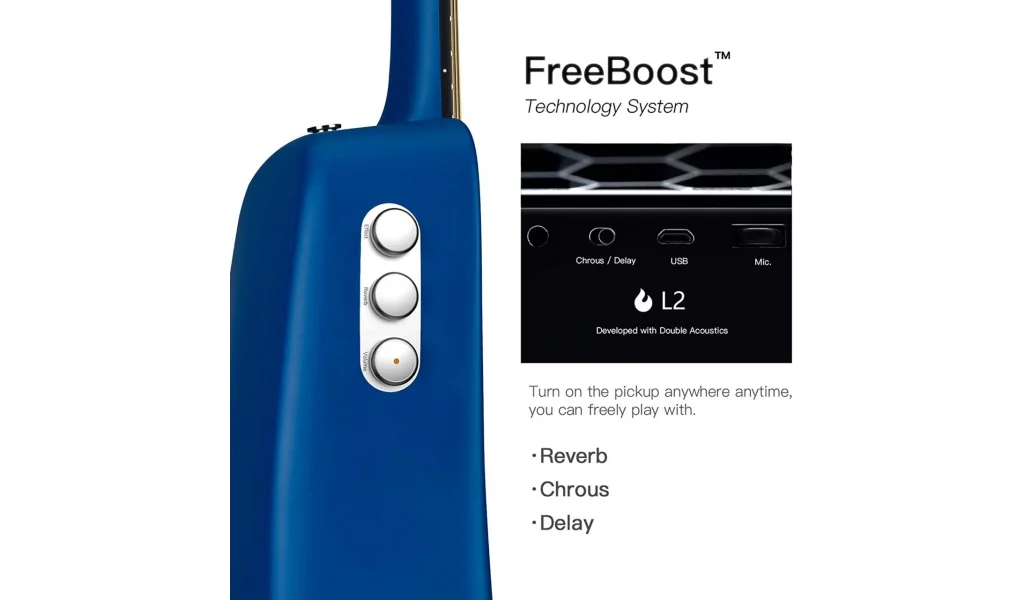 L2 preamp'taki tüm yeni teknoloji, akustik gitarın arkasının hoparlör olarak kullanılmasına izin verir. Preamp'ı istediğiniz zaman, istediğiniz yerde açın ve gitar gövdesinde yerleşik bulunan Reverb, Delay ve Chorus ile her hangi bir kablo veya amfiye ihtiyaç duymadan özgürce çalın.