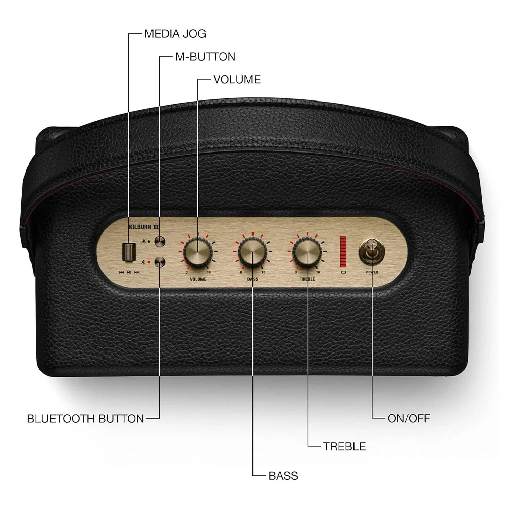 Kilburn III, fiziksel kontrol düğmeleriyle müziğinizi kişiselleştirmenize olanak tanır. Bas ve tiz ayarlarını dilediğiniz gibi yapabilir, şarkı geçişlerini yönetebilir veya M düğmesiyle ön ayarlara anında erişebilirsiniz.