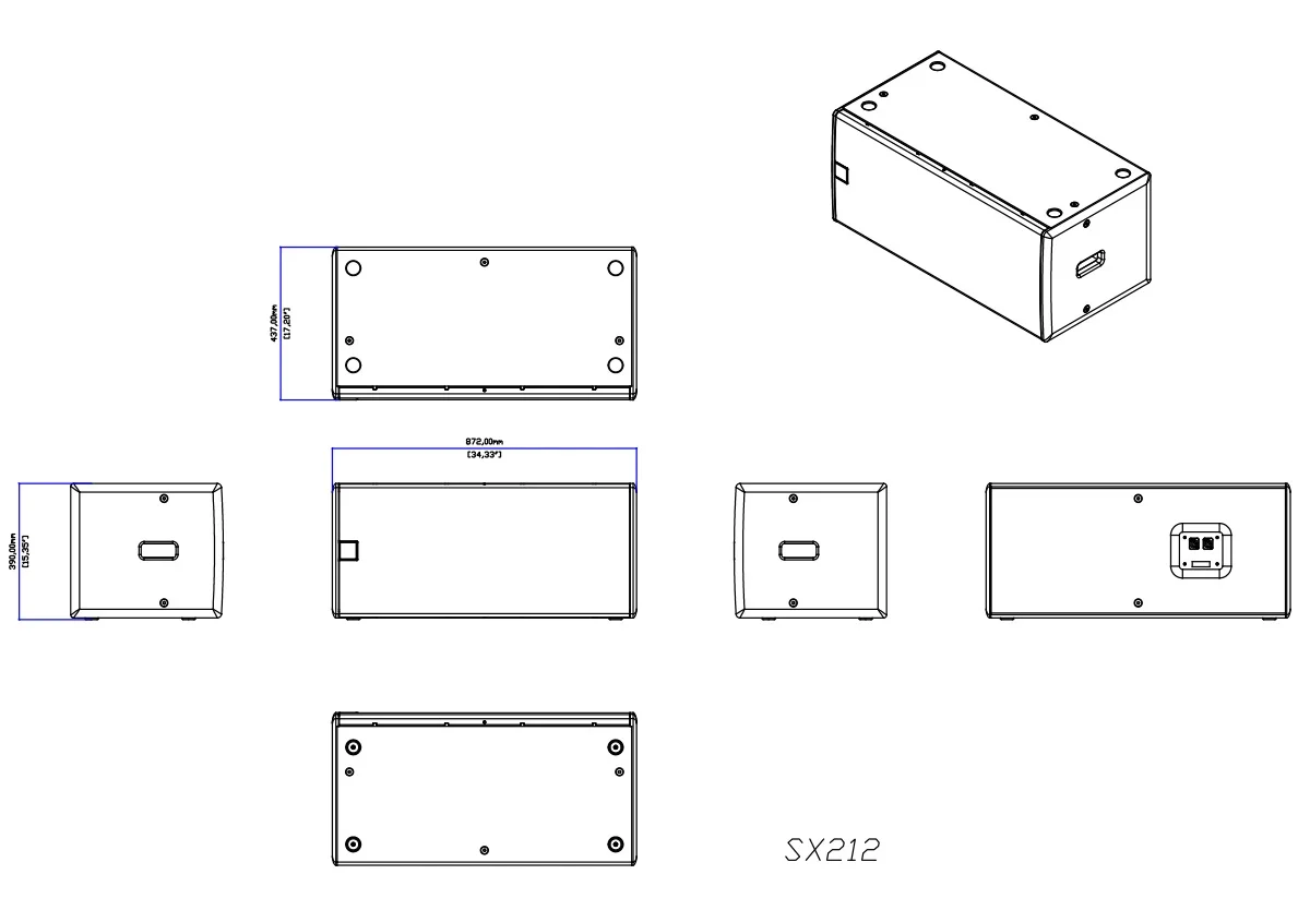 SX212, tam aralıklı hoparlör sistemleriyle birlikte kullanılmak üzere tasarlanmıştır ve sistemin düşük frekans aralığını 35 Hz’e (-10 dB) kadar genişletir. Kabin, kontrplaktan üretilmiş olup içten desteklerle güçlendirilmiştir; bu sayede titreşim enerjisinin kabin panellerine ve ön yüzeye iletimi azaltılır. Delikli çelik ızgarası darbelere dayanacak şekilde önceden kavis verilerek üretilmiştir ve isteğe bağlı olarak askı noktalarıyla donatılabilir.