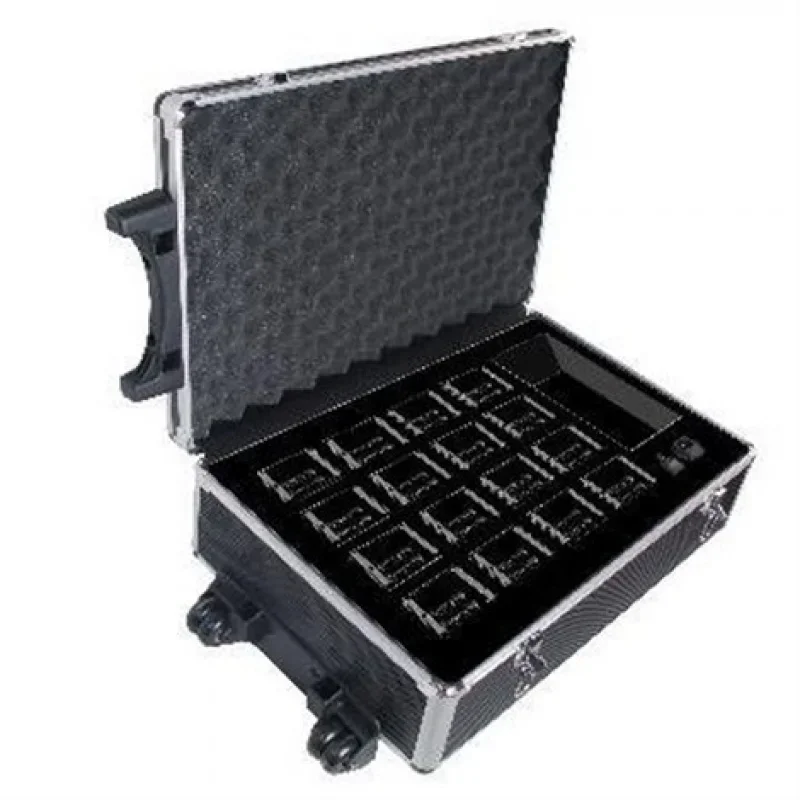 - Kablosuz konferans sisteminin pil şarj cihazı, taşınabilir bir tutamak ve tekerlek ile donatılmıştır, bu da taşınmasını kolaylaştırır.