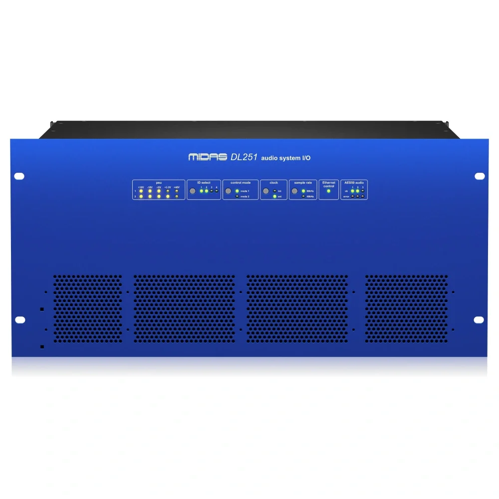 DL251, 5U 19" sabit konfigürasyonlu bir rack I/O ünitesidir. 48 mikrofon/hat seviyesi girişi ve 16 hat seviyesi çıkışıyla efsanevi Midas ses kalitesini sunar. Yıllardır sahnede test edilmiş ve güvenilirliği kanıtlanmış teknolojilerle donatılmıştır. Ödüllü Midas mikrofon preamplifikatörleri, 2.5 dB analog kazanç adımları ve üç adet AES50 ağ bağlantı noktası ile N+1 yedekliliği sağlar. Ayrıca bir Ethernet kontrol portu ve MIDI arayüzü (Giriş, Çıkış, Thru) içerir. Midas M Serisi ve PRO Serisi dijital mikserlerle mükemmel uyumluluk sunarak, sahne ile ana miks konumu dijital bağlantı oluşturur.