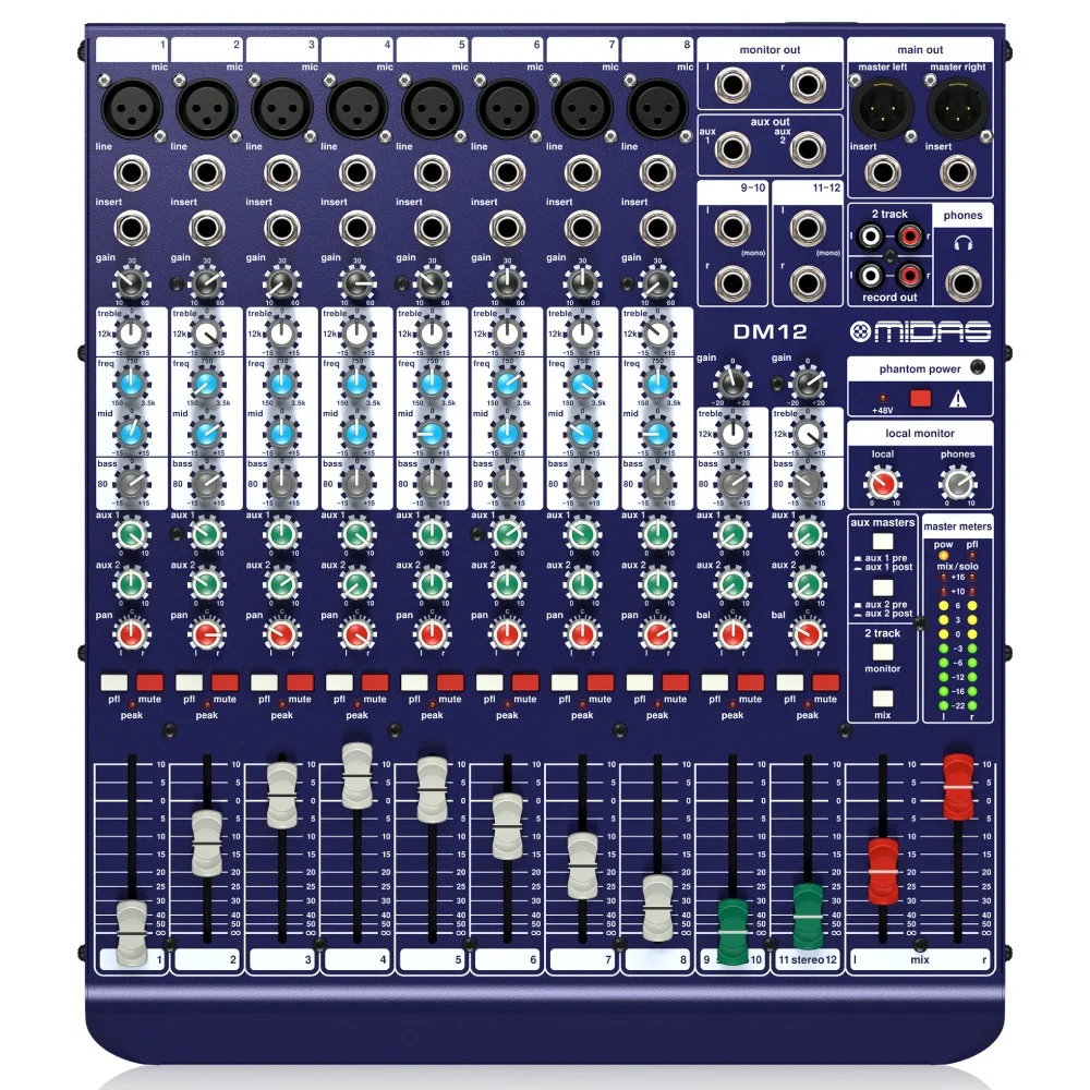 DM12, ses mühendisleri tarafından şeffaflık, düşük gürültü ve yüksek headroomlu tasarımıyla dünya çapında takdir edilen, ödüllü 8 Midas mikrofon preamplifikatörüne sahiptir. Bu preamplifikatörler, gerçek +48 V Phantom Gücü destekler. Ayrıca 12 kanalın tamamında (8 mono ve 2 stereo) TRS hat girişleri, mono kanal insert girişleri, orta frekans taramalı 3 bant EQ, pre/post fader seçilebilir 2 aux gönderim, 2 monitör çıkışı ve 2-track RCA giriş/çıkışı bulunur. Sonuç olarak, tam özellikli bir analog sanat eseri olan DM12 karşınızda!