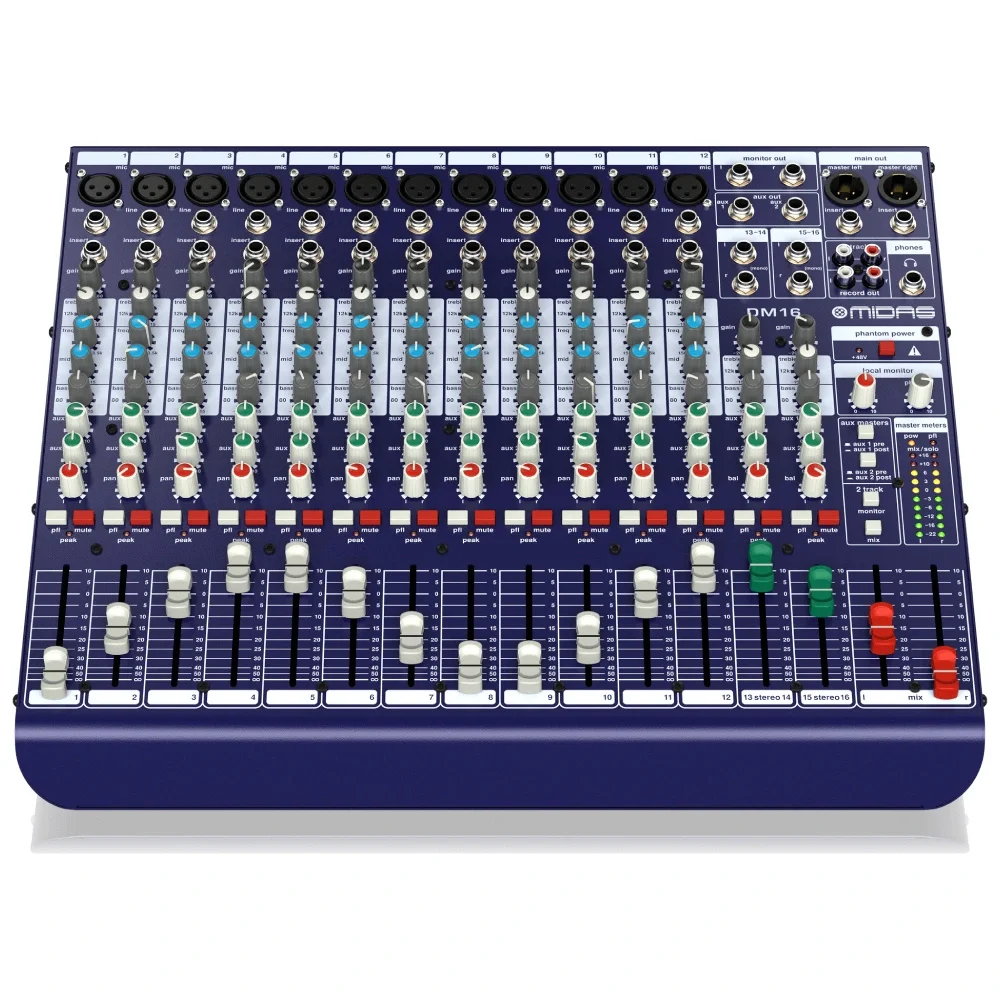 DM16, dünyaca ünlü ses mühendisleri tarafından şeffaflığı, düşük gürültüsü ve yüksek baş mesafesi tasarımıyla övgüyle karşılanan, ödüllü 12 adet MIDAS mikrofon preamp'ını barındırır. +48 V Phantom Power sunan bu preamp'lere ek olarak, cihazda tüm 16 kanal için TRS Hat Girişleri (8 mono ve 2 stereo), mono kanal girişleri, orta frekans süpürmeli 3 bant EQ, fader öncesi/sonrası arasında geçiş yapabilen 2 yardımcı çıkış, 2 monitör çıkışı ve 2 kanal RCA giriş/çıkış bulunur.