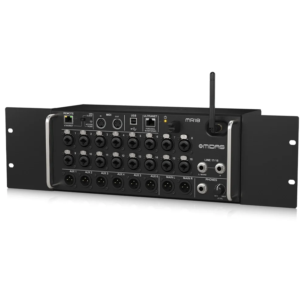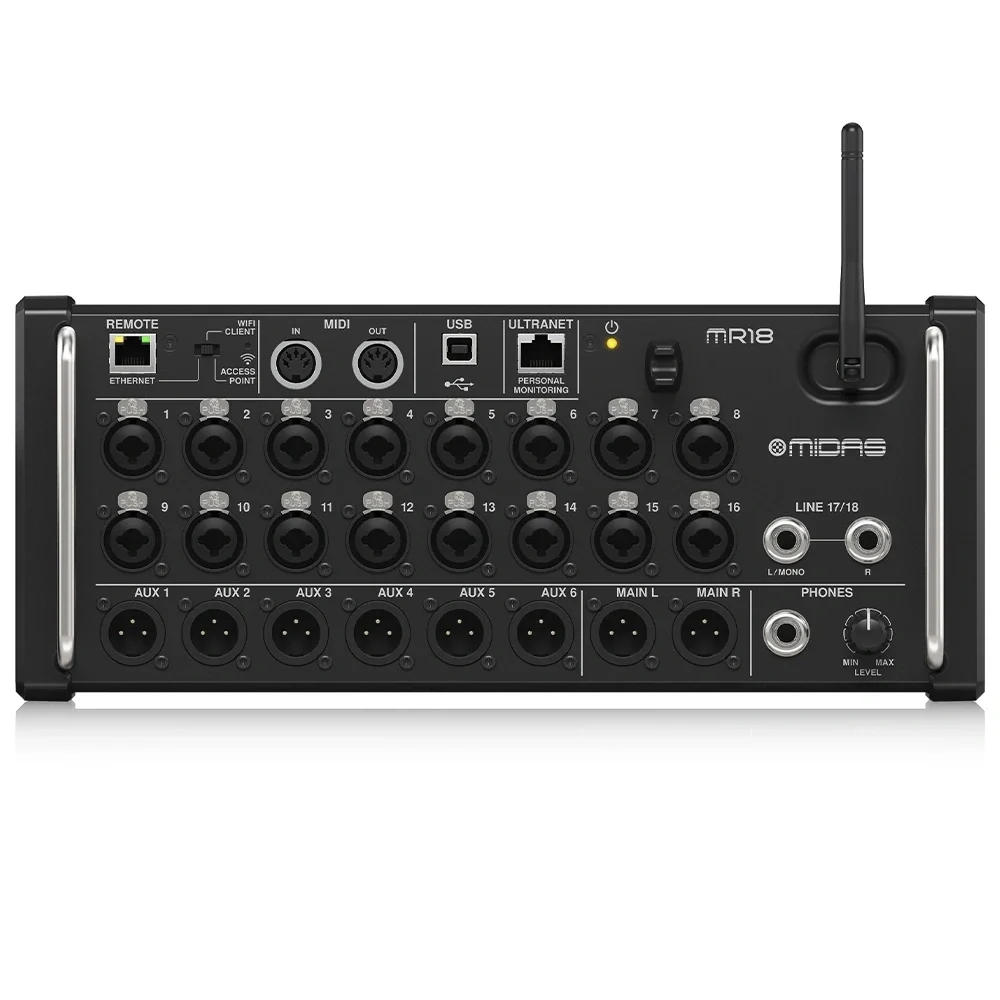 Midas Pro mikrofon amfisi, PRO Serisi miksaj konsolları için geliştirildi ve M32'de de bulunuyor ve önde gelen canlı ses ve kayıt mühendisleri tarafından ünlü Midas sesinin özü olarak kabul edildi. MR18'de, 40 yılı aşkın tasarım mükemmelliği, rakip modellerden daha hassas görüntüleme için benzersiz sıcaklık ve derinlik, zarif bir ambiyans ve kusursuz mekansal konumlandırma sağlamak için birinci sınıf bileşenlerle bir araya geldi. Ödüllü Midas mikrofon preamplifikatörü, dünya çapındaki izleyicileri büyüleyen sonik manzaralar yaratarak nesiller boyu canlı ses mühendislerine en iyi çalışmalarını yapmaları için ilham verdi. MR18, tümü kilitleme mandallı Neutrik kombo konektörler yoluyla girişiniz için tam anlamıyla hazır olan 16 Midas Pro preamp ile donatılmış olarak gelir.