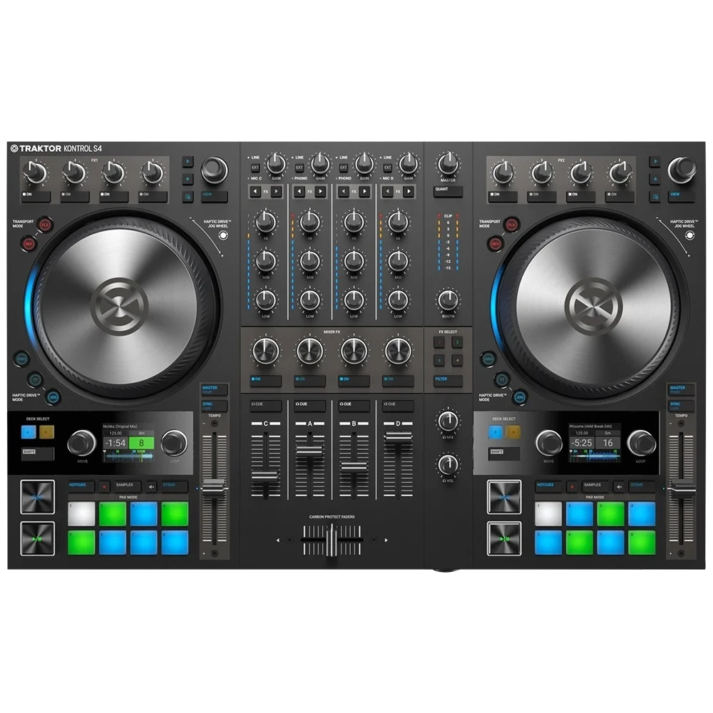 TRAKTOR KONTROL S4, parçalarınızla tamamen yeni yollarla bağlantı kurmanızı sağlar: Motorlu jog tekerlekleri sadece nudging (hafifçe dürtme), scratching, pitch-fading, ve backspins’e tepki vermekle kalmaz, cue noktalarını, loop belirteçlerini doğrudan parmaklarınızın ucuna iletir. RGB LED halkalar ve yüksek çözünürlüklü renkli ekranlar, ön ve ortada ihtiyacınız olan tüm bilgileri standda tutar. İhtiyaç duyduğunuz her şey ihtiyacınız olan yerde. Böylelikle özgürce mixinize odaklanabilirsiniz.