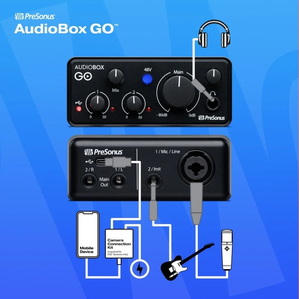 AudioBox GO hareket halinde iken kayıt alabilmeniz için gerekli herşeyi sunmaktadır. Mikrofon, enstrüman ve line girişler; hoparlör ve kulaklık çıkışları, bus power verebilen USB-C uyumlu çıkış ile AudioBox GO bir çok profesyonel özelliği cebinize sığacak boyutlarda sunmaktadır.