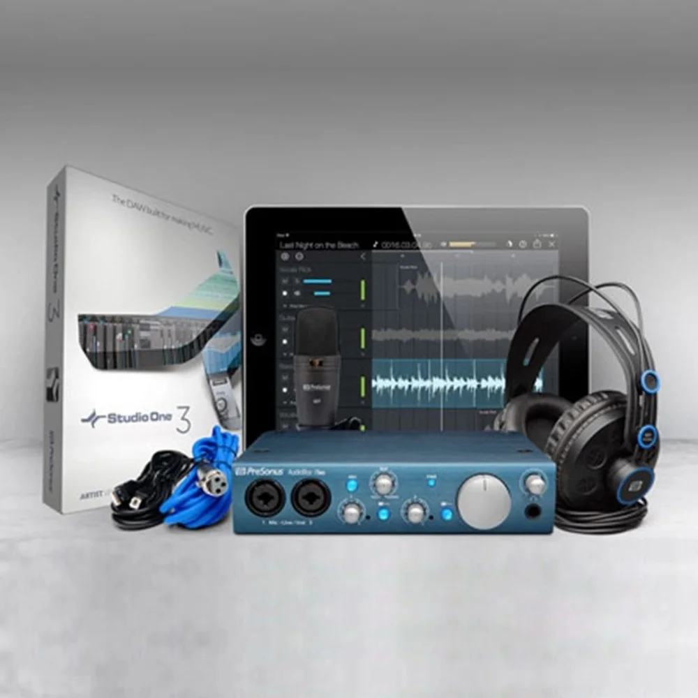 Presonus'un Audiobox iTwo Studio seti ile birlikte gelen Presonus iTwo ses kartı, StudioOne yazılımı, M7 condenser mikrofonu, HD7 kulaklık ve gerekli kablolar ile kayıt yapmaya başlamak için her şey elinizin aldında.