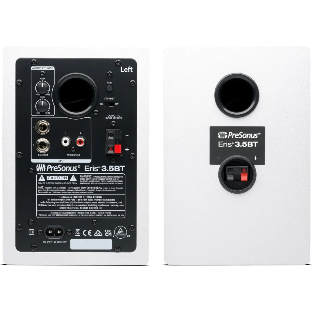 PreSonus® Eris® 3.5 BT referans monitörleri kablosuz olarak Bluetooth 5.0 veya arka paneldeki ¼ inç TRS ve RCA girişleri ile ve ön paneldeki ⅛ inç stereo line girişi ile neredeyse hemen her türlü ses kaynağına bağlanır. Ayrıca ön panelde kolay erişilebilir (ve yüksek sesli!) ⅛ inç stereo kulaklık jakı da bulunur; Bu girişe kulaklık takıldığında hoparlörlerden gelen ses kesilir.