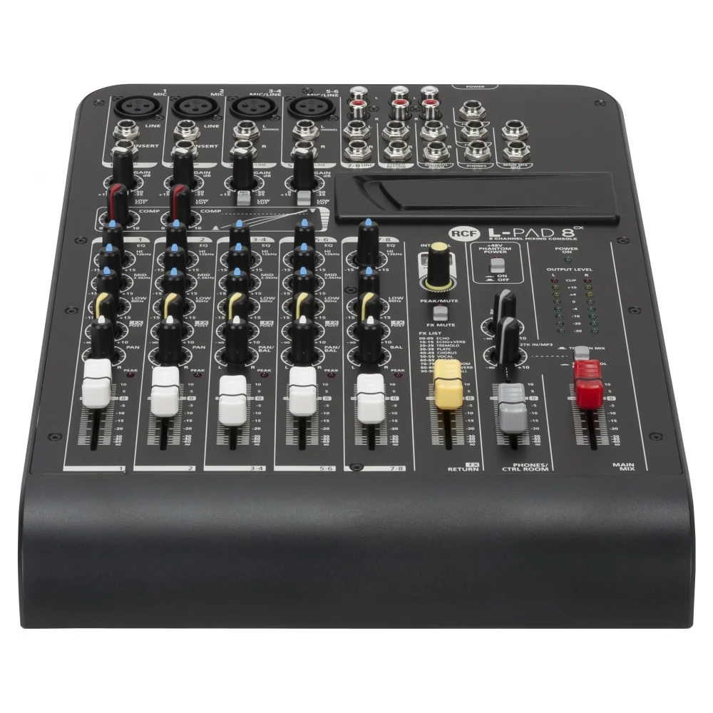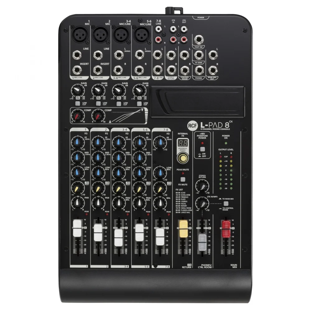 4 mikrofon, 3 stereo kanal, 99 Program Efektleri ile L-PAD8CX Toplantı, Arka fon müziği ve küçük partiler için ideal bir ses mikseridir. Mikrofon kanallarındaki iki tek kontrollü kompresör, daha dinamik karmaşık sinyallerin bile işlenmesine yardımcı olur. Süper çok yönlü LIVEPAD yuvası, daha esnek kullanım için isteğe bağlı L-PAD MP3 ÇALAR, ÇALAR/KAYDEDİCİ veya BLUETOOTH BAĞLANTI kartlarının takılmasına olanak tanır. Doğru İtalyan tasarımı sayesinde L-PAD8CX'in her durumda tutulması, taşınması ve kullanılması kolaydır.