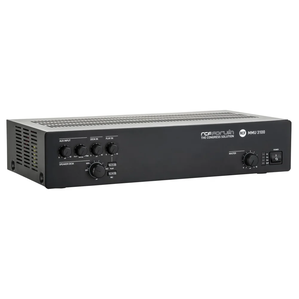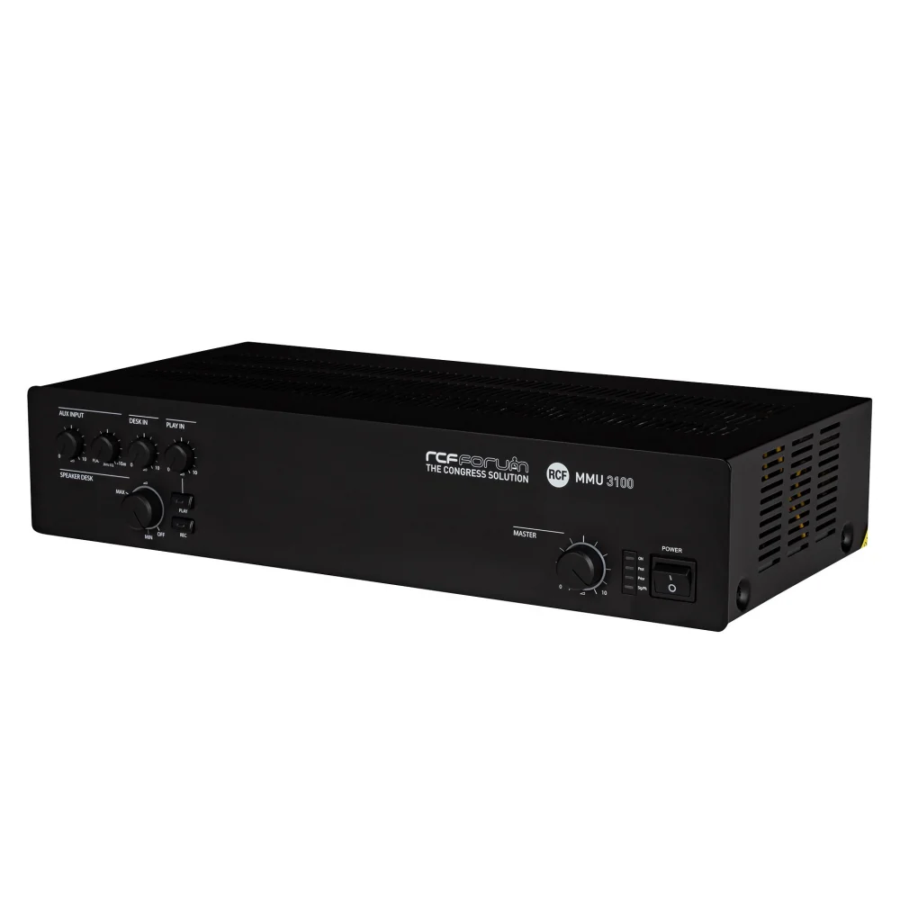 RCF MMU3100 80 Adet Mikrofon kapasiteli bir konferans yönetim konsolu, aynı zamanda 160W/100V Gücünde amplifikatör, Telefon ve Müzik girişi ile all in one konferans sistemidir.