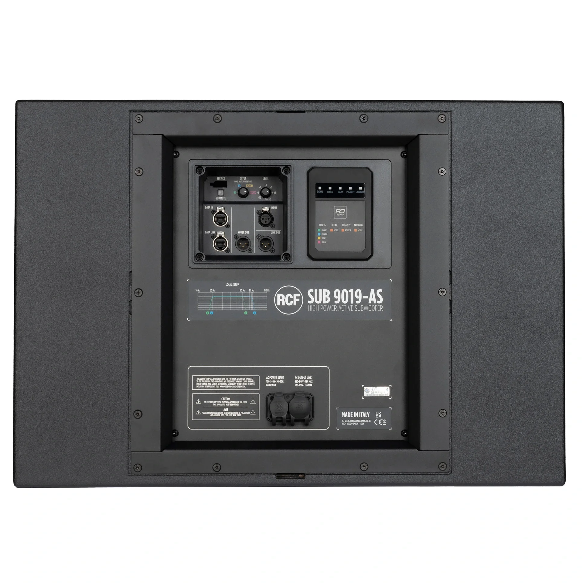 SUB 9019-AS, 138 dB'ye kadar Maksimum SPL sağlayan ve güçlü 4000 W Sınıf-D amplifikatörle çalışan yüksek performanslı 19 inç aktif subwoofer'dır. Zorlu turlar için tasarlanan SUB 9019-AS, dayanıklı Poliürea kaplamalı, turlara hazır, hava koşullarına dayanıklı bir kabine ve kolay taşıma için çıkarılabilir bir ön taşıyıcıya sahiptir. RDNet ağ yönetimiyle kontrol hassastır ve ayarlanabilir EQ, gecikme, kardioid seçenekleri ve RCF hoparlörler için özel geçiş ön ayarları sunar. RDTap aracılığıyla yenilikçi temassız yapılandırma, ünite güçsüzken bile sorunsuz kurulum sağlayarak her seferinde mükemmel entegrasyon sağlar. Küçük ayak izine ve hafif kabinine rağmen SUB 9019-AS, en ince düşük frekanslı varyasyonlara bile sadık kalarak güçlü ancak net baslar üretir.