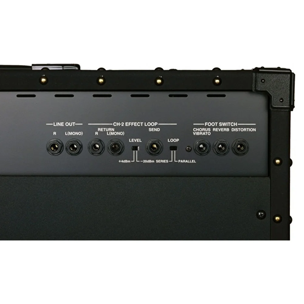 JC-120’nin arka paneli bağlantı opsiyonları ile doludur. Mono veya stereo efektlerinizi bağlamak için effect loop giriş ve çıkışları, seri yada paralel kullanım opsiyonunu bile sizlere sunabilmektedir. Line Out jak çıkışları mono veya stereo olarak sesinizi genel seslendirme mikserlerine veya kayıt cihazlarına kullanışlı olarak gönderebilmenizi sağlar. desteklediği opsiyonel kontrol pedalları ile amfinizin chorus/vibrato, reverb ve distortion gibi efektlerini performanslarınız anında açıp/kapama işlemini yapabilmenizi sağlar.