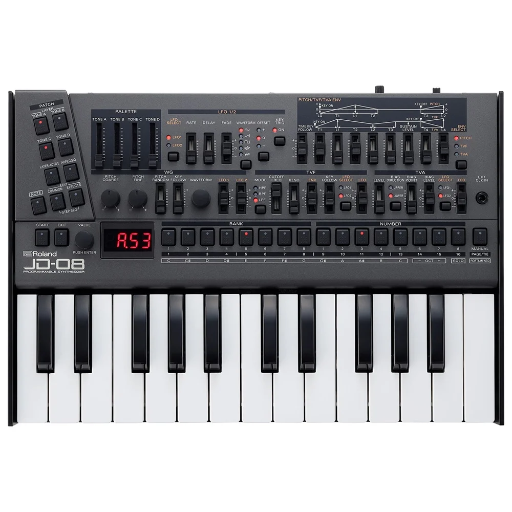 JD-08'de yerleşik bir USB-C ses/MIDI arabirimi bulunur, böylece her tür bilgisayar prodüksiyon yazılımıyla çalabilir, kaydedebilir ve senkronize edebilirsiniz. Diğer MIDI donanımlarıyla arabirim oluşturmak için tam boyutlu MIDI I/O da mevcuttur. JD-08'in yerleşik sequencer ve arpeggiatorünü eski analog enstrümanlardan ve modern Eurorack sistemleri üzerinden çalıştırmak için harici bir clock girişi bile var.