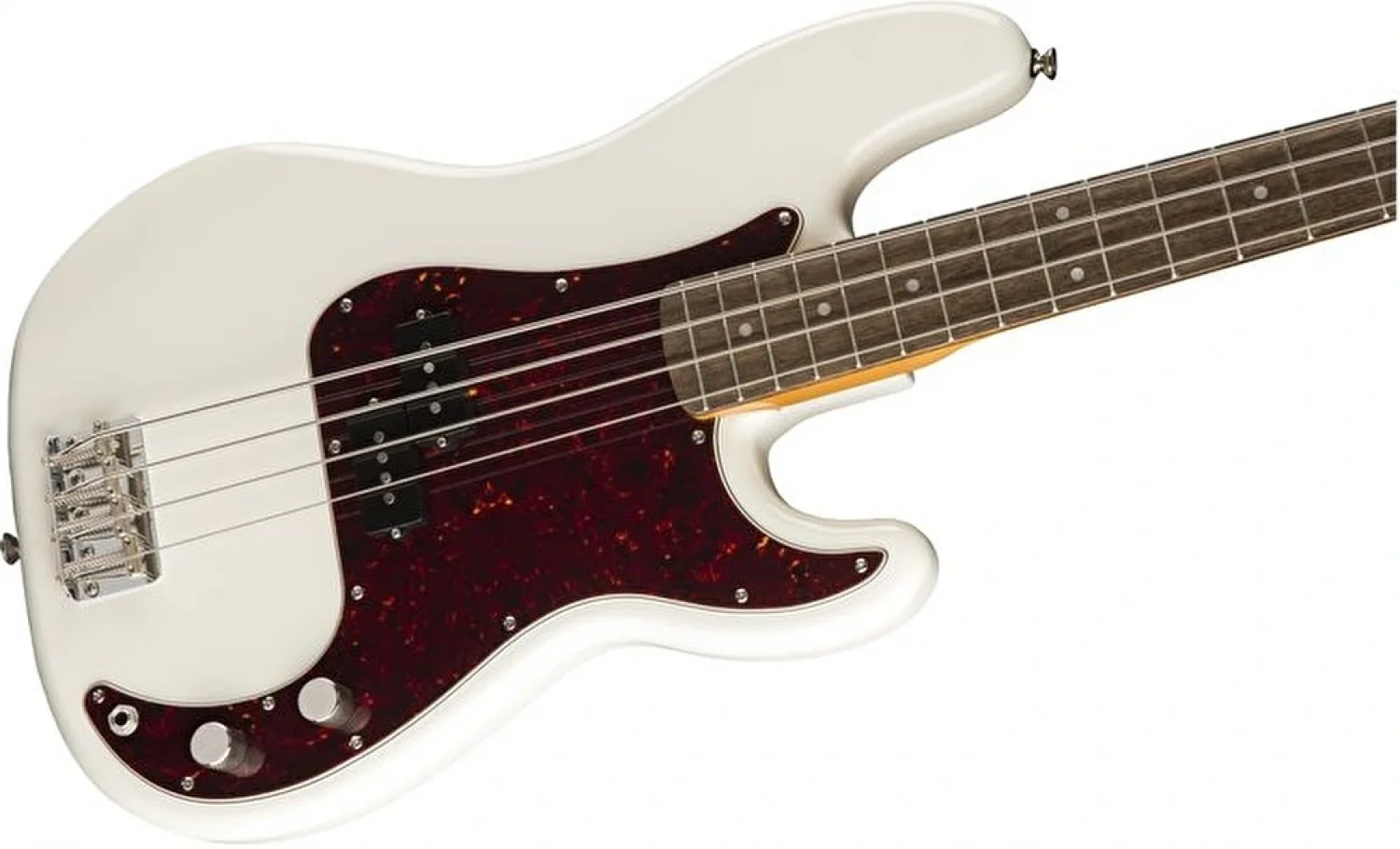 Classic Vibe '60s Precision Bass®, Fender estetiğini bünyesinde barındırır ve Fender tasarımlı alnico split-coil manyetiğinin gücüyle muazzam ton üretir. Gitaristleri kendine çeken özellikler arasında, kolay çalınan 9,5” yarıçaplı klavye ve dar uzun perdeler sahip ince, rahat “C” şeklinde bir sap profili ve ayrıca dişli saddle'lara sahip vintage tarzı bir köprü bulunur. Bu nostaljik Squier modeli aynı zamanda 1960'lardan ilham alan hedstock'a, zengin görünümlü nikel kaplama donanıma ve eski tarz bir hava için kaygan, vintage renkli parlak bir sap kaplamasına sahiptir.