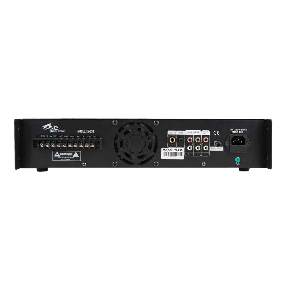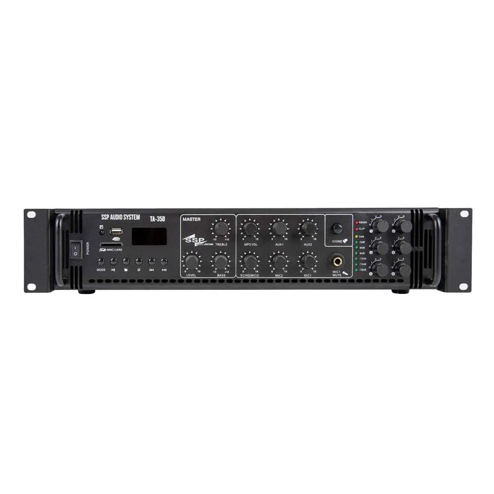 SSP Audio TA350, 350W çıkış gücüyle güçlü ve net ses performansı sunar. 4-16 ohm, 70V ve 100V çıkış desteği, farklı hoparlör sistemleriyle uyum sağlar. Cihaz, 2 mikrofon girişi, 2 line input ve 1 line output ile esnek bağlantı seçenekleri sunar. USB, SD kart, Bluetooth ve FM tuner ile dijital medya entegrasyonu sağlar. 6 farklı zone çıkışı, büyük alanlarda ses kontrolü imkanı tanır. Kullanıcı dostu kontrol paneli ve dayanıklı metal yapı, uzun ömürlü performans sunar. 2U rack montajına uygundur.