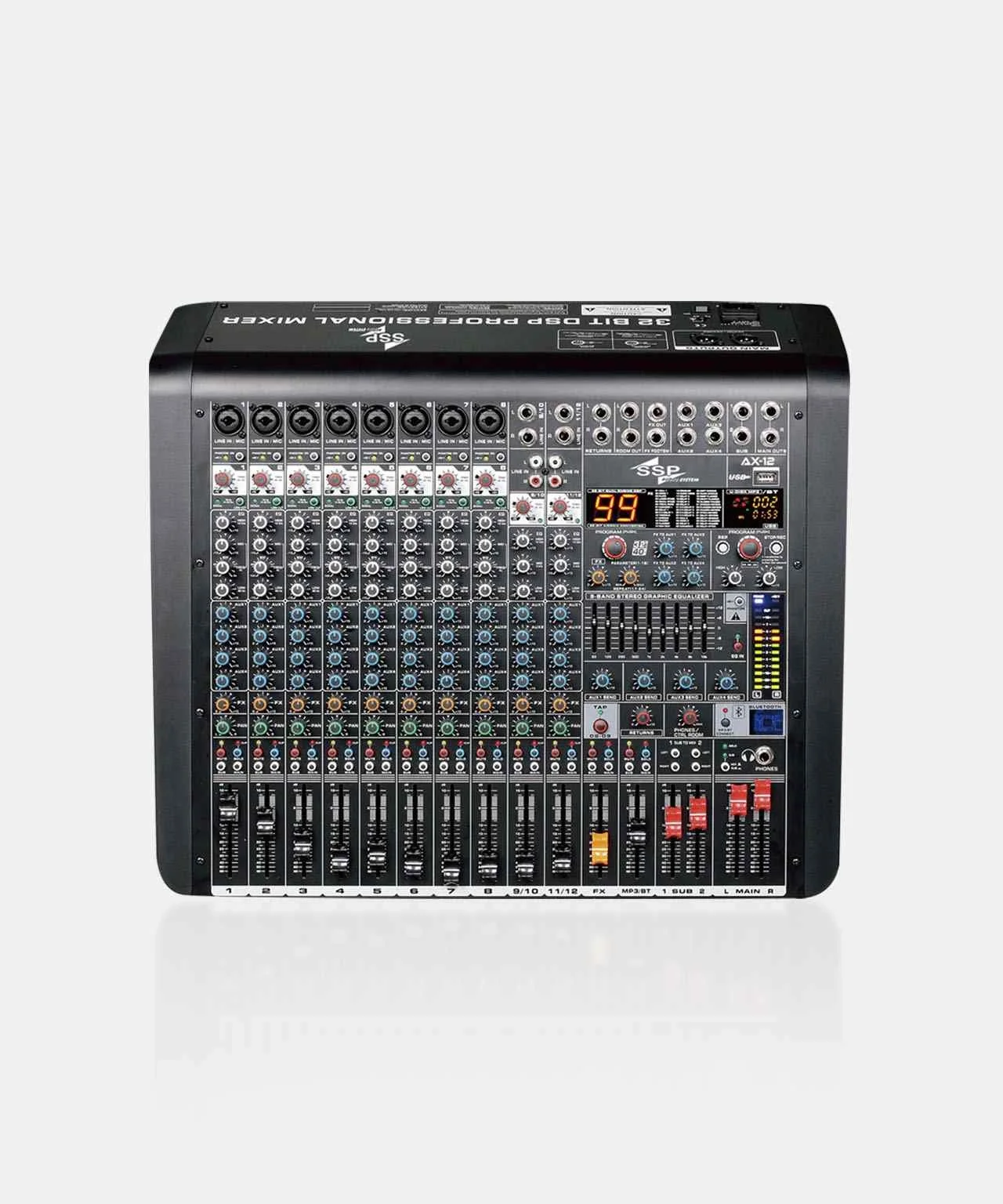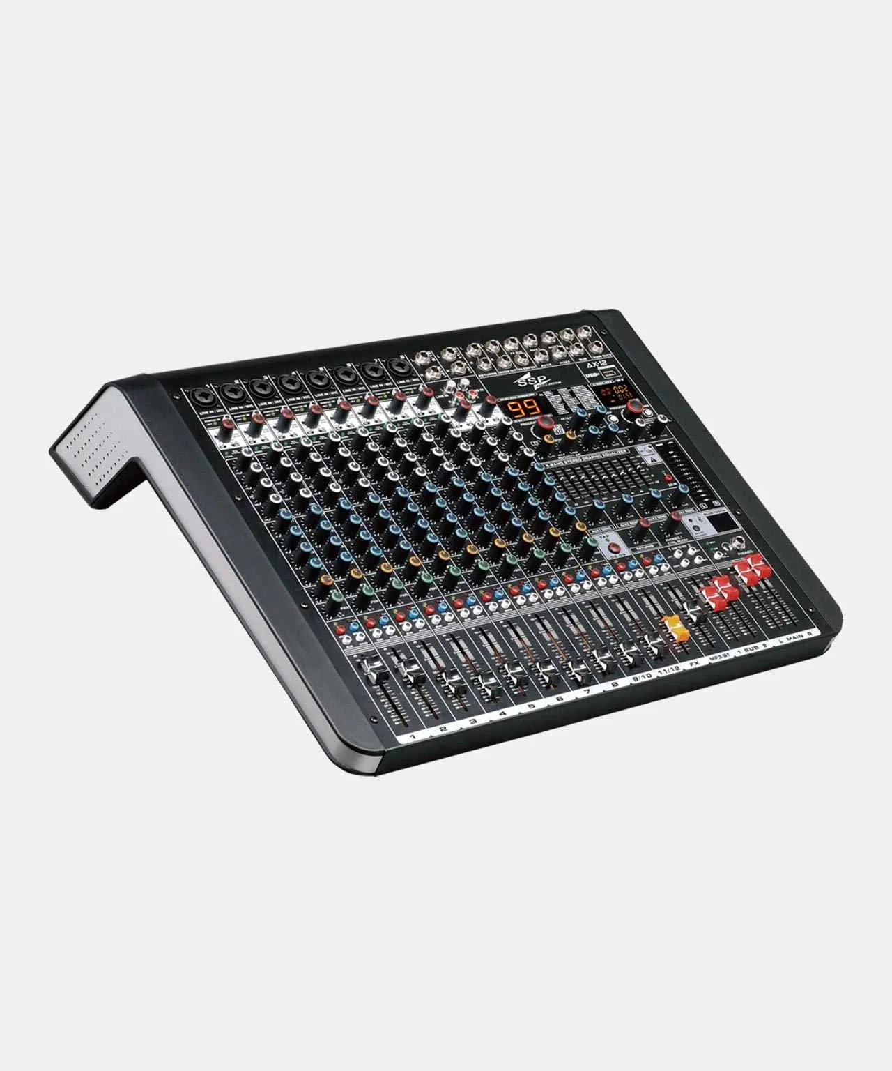 SSP AX-12, canlı performanslardan ve provalardan küçük stüdyo kurulumlarına ve multimedya prodüksiyonlarına kadar geniş bir yelpazedeki ses uygulamaları için tasarlanmış, kompakt ve son derece çok yönlü bir ses mikseridir. 8 mikrofon girişi ve 4 hat girişi de dahil olmak üzere 12 giriş kanalına sahip olan bu mikser, birden fazla ses kaynağını kolaylıkla barındırmak için gereken esnekliği sağlar. Her kanal, ayrıntılı ton şekillendirme için 3 bantlı bir EQ içerirken, dahili 99DSP efekt işlemcisi, miksinizi yankı, gecikme, eko ve daha fazlasıyla zenginleştirir.