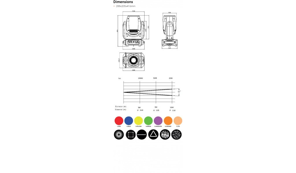 1 sabit gobo tekerleği: 6 gobo + açık, Gobo çapı: 22 mm, Gobo kalınlığı: 0,8 mm