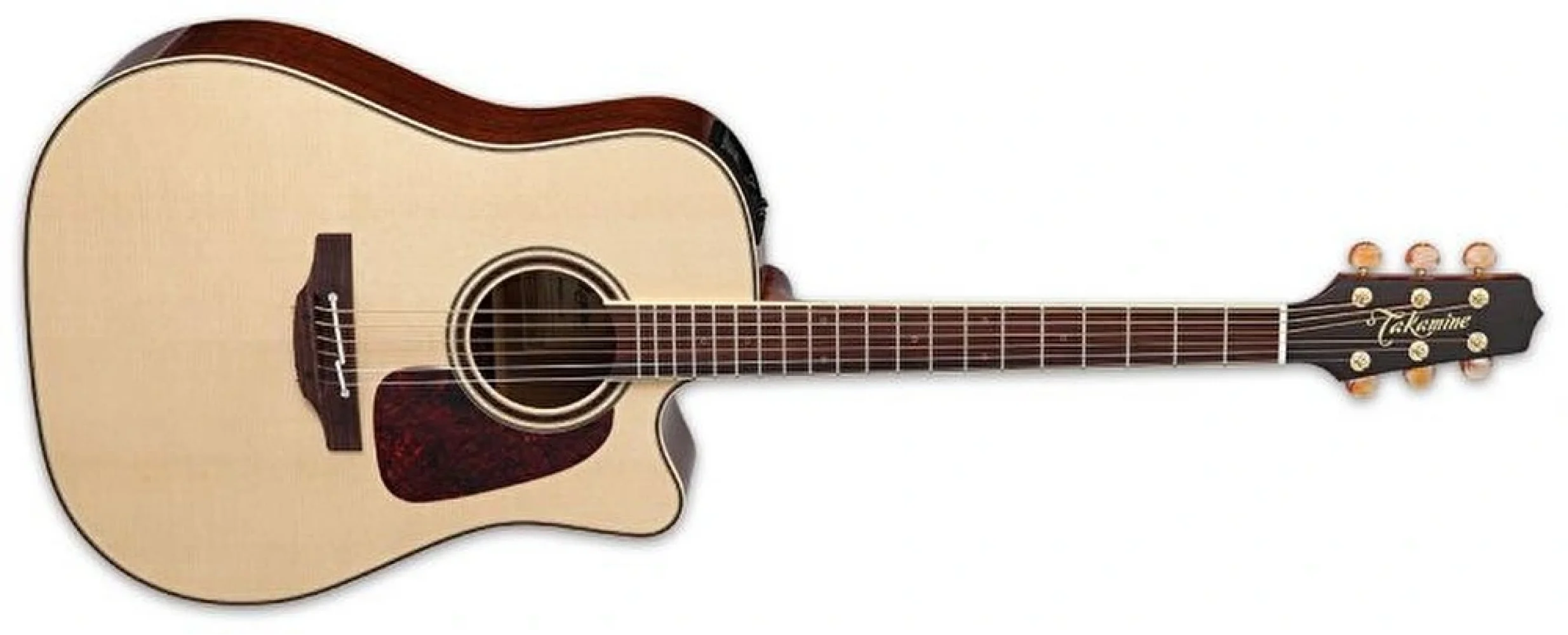 Diğer özellikler arasında, klavyenin üst erişimlerine kolay erişim için uygun bir Venetian Cutaway ve Takamine'nin asimetrik sap profili - bas tarafında biraz daha incedir, böylece elinizin doğal şekline uyum sağlayarak rahat bir şekilde sonuçlanır. Ayrıca sahip olduğu bölünmüş kemik saddle, daha hassas bir tonlama sağlar.