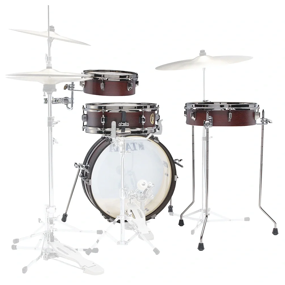 Koyu kahverengi ahşap kasnaklar, bas davula vintage bir hava katar.