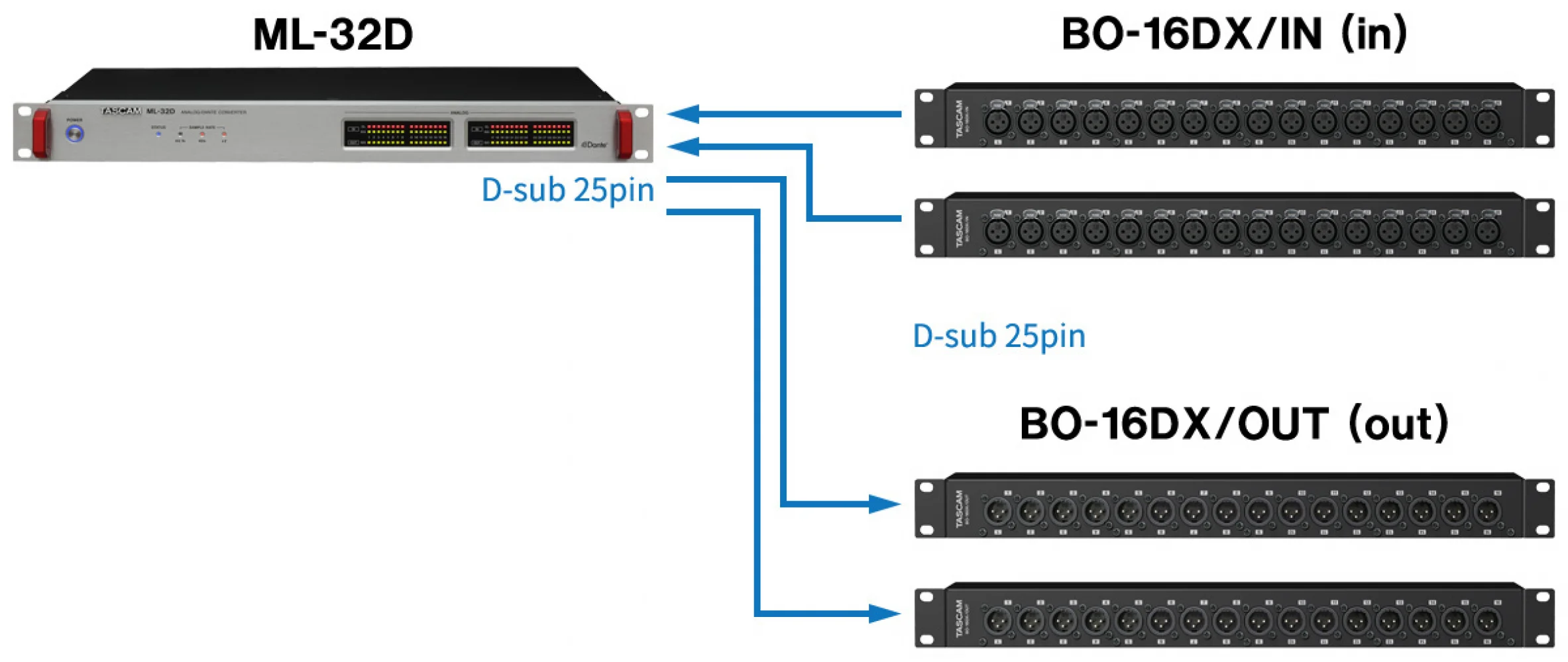 BO-32DE, BO-16DX/IN and BO-16DX/OUT are versatile breakout boxes that provide up to 32 balanced analogue audio inputs/outputs for audio devices equipped with D-sub audio inputs/outputs like the Tascam ML-16D/ML-32D or older multi-track recorders like the Tascam DA-98HR or DA-78HR, for example. They can also be used with any other product fitted with D-sub connectors compatible with standard Tascam pin assignment according to AES59-2012.