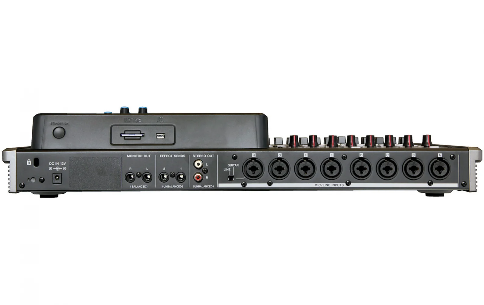 Sekiz XLR mikrofon / hat girişi, dörtlü banklarda değiştirilebilen yoğunlaştırıcı mikrofonlar için hayali güç sağlar. Bir giriş, gitar veya bas doğrudan girdi kaydı için bir alet seviyesinde empedans anahtarı içerir.