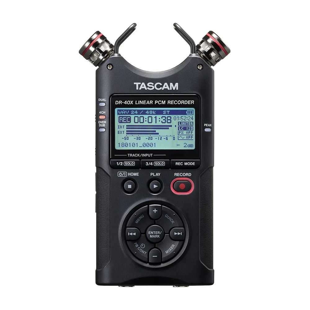 Tascam DR-40X kayıt cihazı ile kompakt, elde tutulmaya uygun bir tasarım ile profesyonel kalitede 4 kanallı kayıtlar alabilirsiniz. Bu kayıt cihazı, DSLR kameralarla çekim yapan film yapımcıları, müzisyenler, ses tasarımcıları, yayıncılar ve yüksek kaliteli ses kaydı özelliğine basit bir çözümle ulaşmak isteyen diğer içerik üreticileri için idealdir. DR-40X üzerinde bulunan çift mikrofon, A/B vey X/Y ekseninde stereo kayıt almak için ayarlanabilirken, cihaz üzerindeki XLR/TRS Combo girişler ile ekstra mikrofon ve ses kaynakları kullanarak kayıt gerçekleştirebilirsiniz. Tascam DR-40X, ayrıca USB ses kartı özelliği ile bilgisayara direkt olarak kayıt alabilir. Tascam DR-40X ile geniş kayıt ve bağlantı seçenekleri ile yüksek ses kaliteli içerikler üretebilirsiniz.