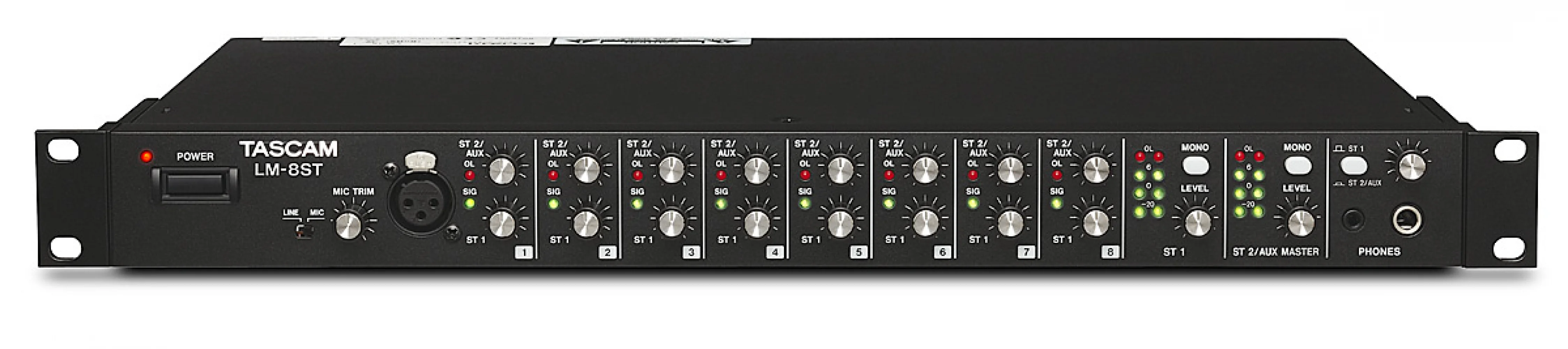 The LM-8ST is a compact line mixer for installation, studio submixing, keyboardists or anyone who needs a mix of line signal sources. Eight stereo input sources like CD/MP3 players, tuners, instruments etc. can be routed independently to a pair of stereo outputs. For the second output the user can choose between pre and post-fader routing. Input and output level controls and metering keep signals under control. A microphone input is also provided for announcements or performance. Master bus inputs and outputs are available for cascading multiple units.