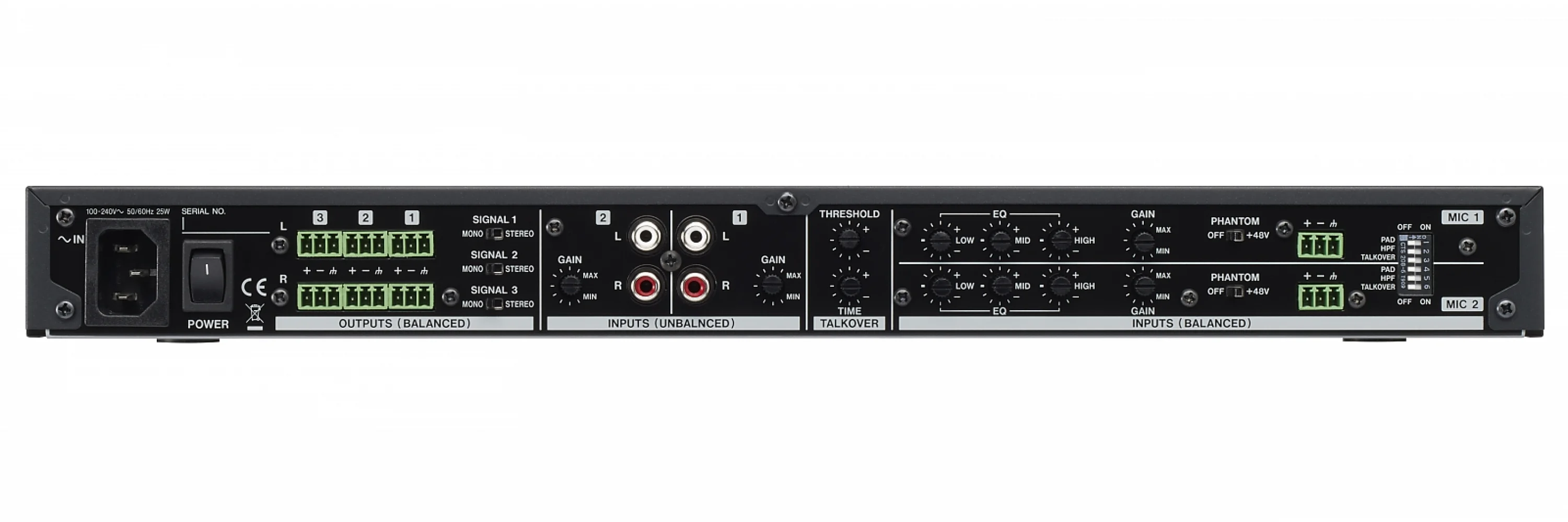 Comes equipped with two +48V phantom power capable mic inputs and automatic attenuation of music for superior intelligibility during announcements