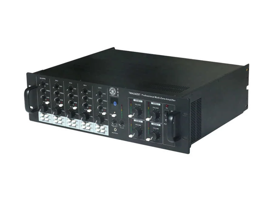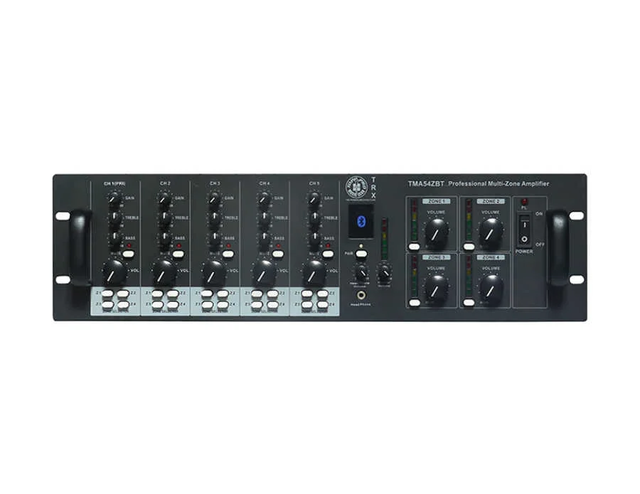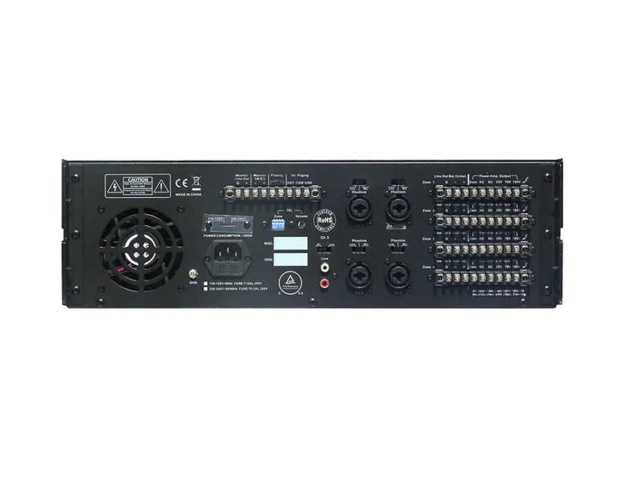 4 x 120W 100V / 8 ohm 4:Mic/Phantom:-50dBV; 1:Line: -10dBV balance Telephone paging girişi Her kanal için 4 Bölge seçim anahtarı , 5 Kanal Sessiz kontrol, Bluetooth bağlantı imkanı Dimensions:(WxHxD) 483mm(W) x 133mm(H) x 395mm(D)
