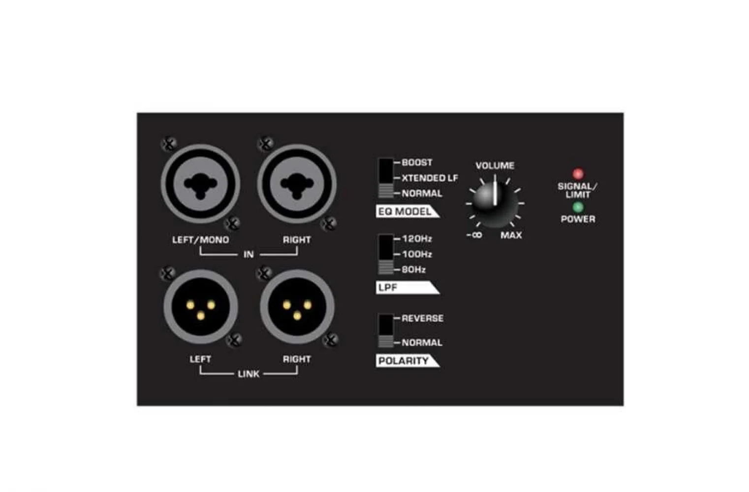 - Dış Kontroller Ses Kontrolü / Faz Anahtarı / EQ Mod Seçici Anahtarı / Düşük Geçiş Filtresi Anahtarı / Güç Açma (Yeşil LED) / Limiter (Kırmızı LED)