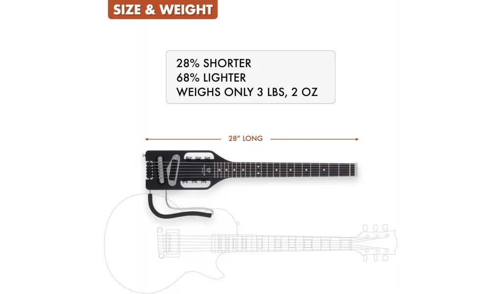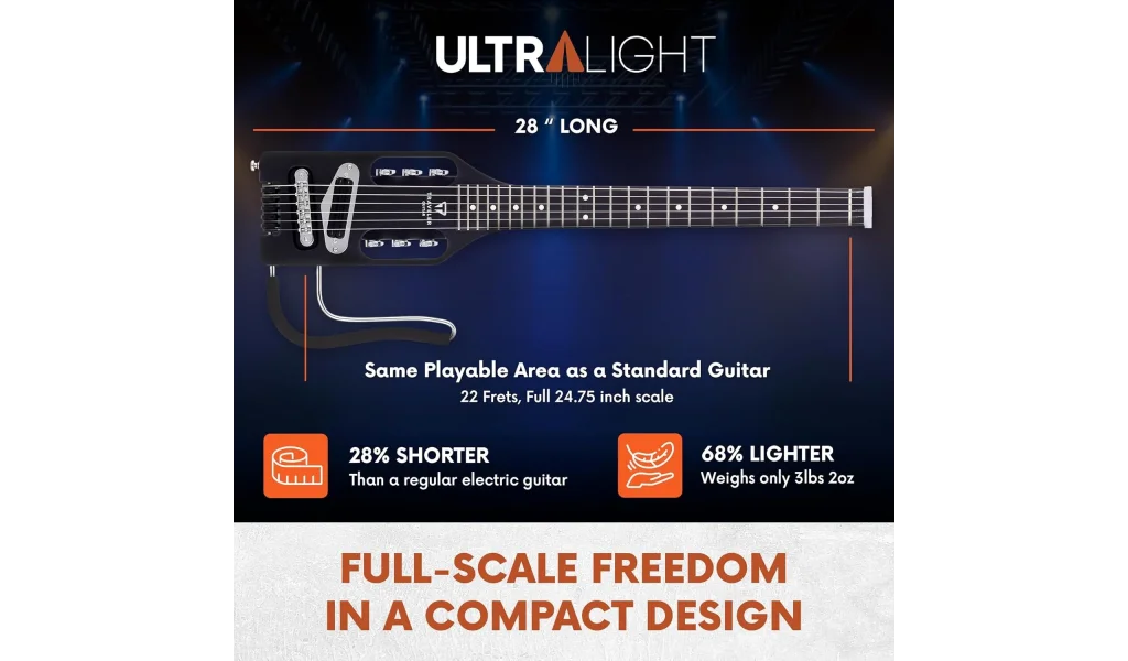 Ultra Light serisi elektro gitar, mevcut en küçük, en hafif tam ölçekli elektrikli seyahat gitarıdır. Tescilli In-Body Tuning System, gövdeye yerleştirilen standart akort mekanizmasını kullanır ve bu da uzun bir sap ihtiyacını ortadan kaldırır. Sonuç olarak, normal tam boy bir elektro gitardan %28 daha kısa ve %68 daha hafif bir gitar ile çalma şansınız olur. Gövde İçi Akort Sistemi ™ Patentli Gövde İçi Akort Mekanizması sayesinde tipik bir elektro gitardan 28% daha kısa ve %68 daha hafif bir gitar elde edersiniz. Neden daha ağır bir gitar taşıyasınız ki?