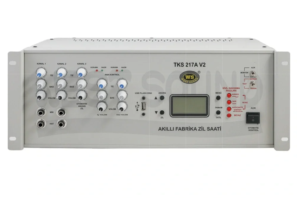 KS 217 Fabrika saati özelliklerine ilave olarak iki adet amplifikatör çıkışına sahiptir. Bu özelliği ile bir fabrikanın başka bir cihaza ihtiyacı olmadan tek bir cihaz ile programlı zil ve anons sorununu çözer. l. amplifikatör çıkışı normal ses istenen yerlere trafolu (100 volt) hoparlörler ile kullanılır, 2. Amplifikatör çıkışı yüksek ses istenen yerlerde 4-8 n hoparlörler bağlanarak kullanılır. AKILLI FABRiKA ZiL SAATi Fabrikalar ve işyerlerinde çalışanların işe giriş-çıkış saatini mola zamanını yemek zamanını program dahilinde müzik ve söz ile bilgilendirir. İş başlangıç saatlerinde İş sağlığı ve güvenliği ile ilgili ikazlarda bulunarak güvenli bir çalışma ortamı sağlar. Günün programlanan saatlerinde salgın hastalıklarla hijyen ve korunma kuralları ile ilgili uyarılarda bulunarak iş yerimizin tedbirli sağlıklı bir işletme olmasını sağlar.