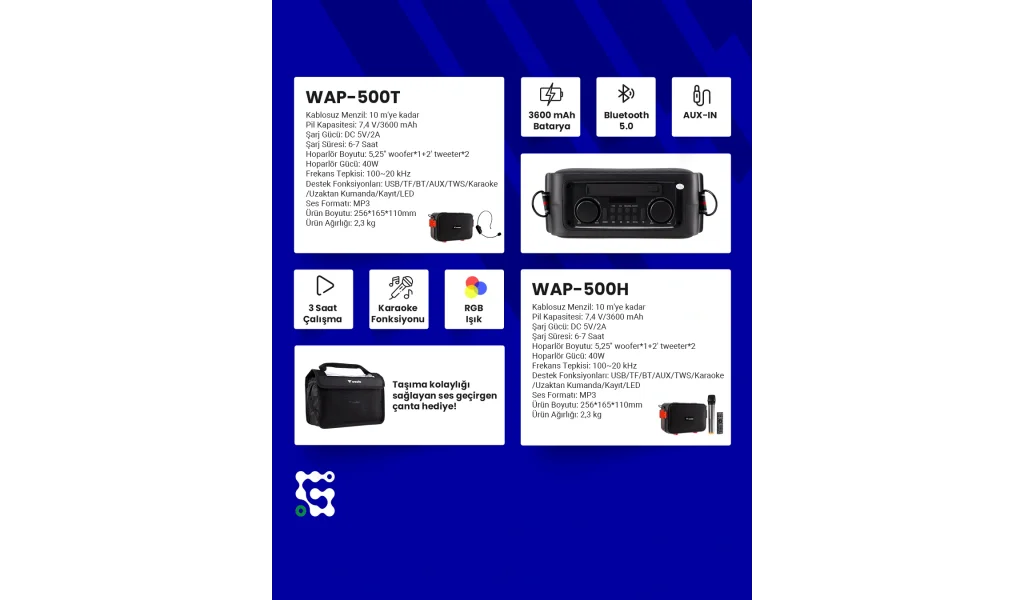 Westa WAP-500H Öğretmen, Din Görevlisi, Sunum yapanların kulanımına uygun, 50-100 kişilik topluluklar için uygun 6" Taşınabilir Ses Sistemidir. 40W amfi gücü, bluetooth, USB müzik kaynağı, 25 metreye kadar kablosuz mikrofon, uzaktan kumandaya sahiptir.