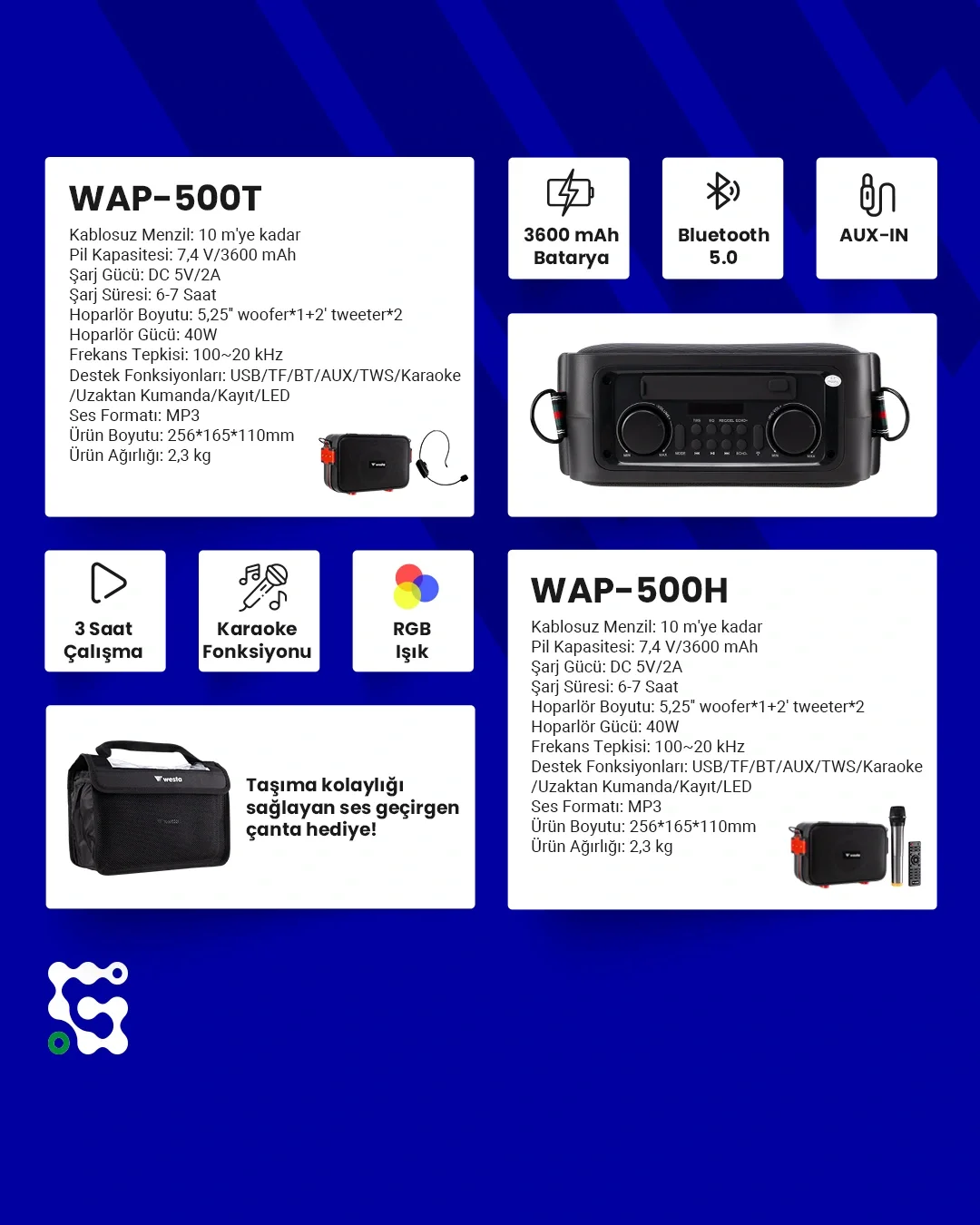 Westa WAP-500H Öğretmen, Din Görevlisi, Sunum yapanların kulanımına uygun, 50-100 kişilik topluluklar için uygun 6" Taşınabilir Ses Sistemidir. 40W amfi gücü, bluetooth, USB müzik kaynağı, 25 metreye kadar kablosuz mikrofon, uzaktan kumandaya sahiptir.