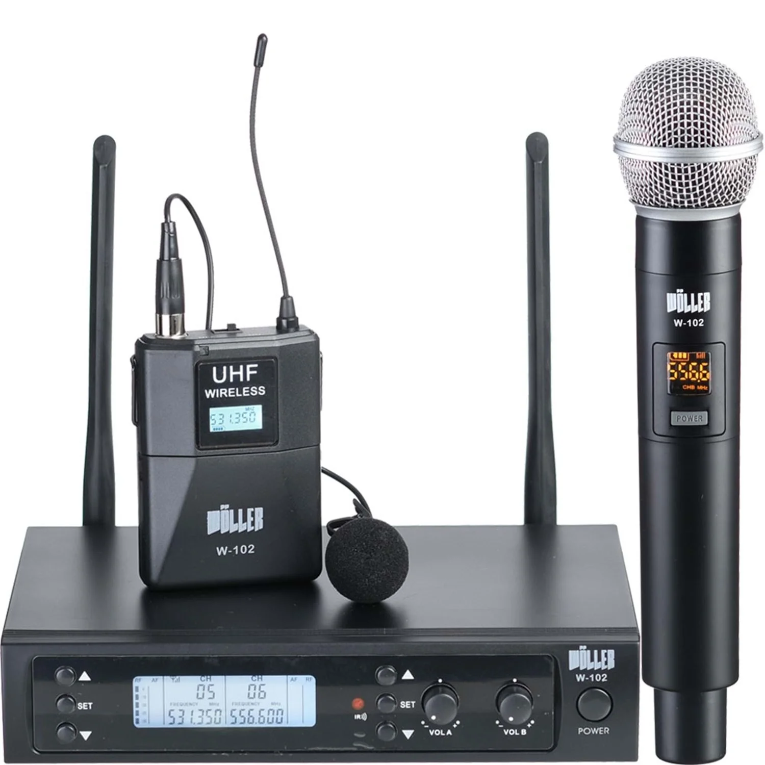 Wöller W-12EY Doğrudan aktif bir hoparlöre veya ses mikseri kanalına takılan 2 kanal alıcısı ile yeni nesil Çift mikrofonlu El+YAKA kablosuz mikrofon setidir.