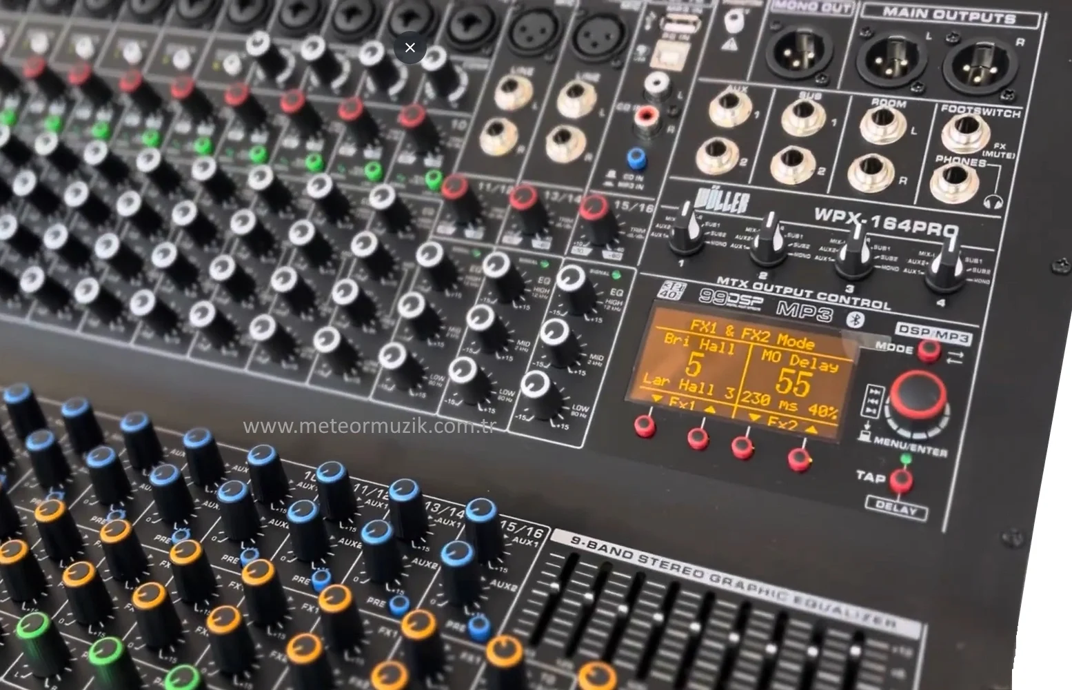 Woller WPX-164PRO, 16 kanallı yüksek güçlü profesyonel power mikserdir. 12 mono + 2 stereo giriş, 4 ayrı 1300W amplifikatör çıkışı ve gelişmiş DSP efektleriyle düğün, konser, canlı müzik, etkinlik ve kurumsal ses sistemleri için tasarlanmıştır. Bluetooth streaming, USB kayıt özelliği ve +48V phantom güç ile modern ihtiyaçlara cevap verir.