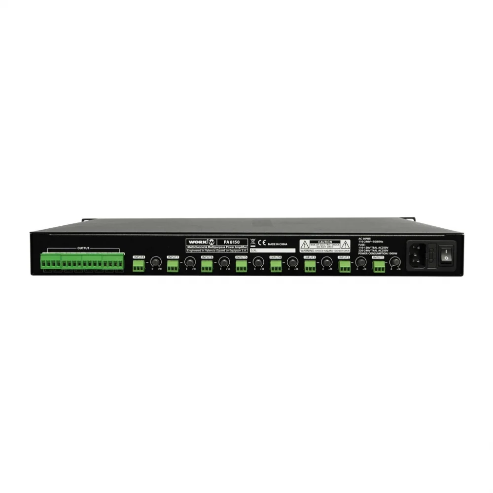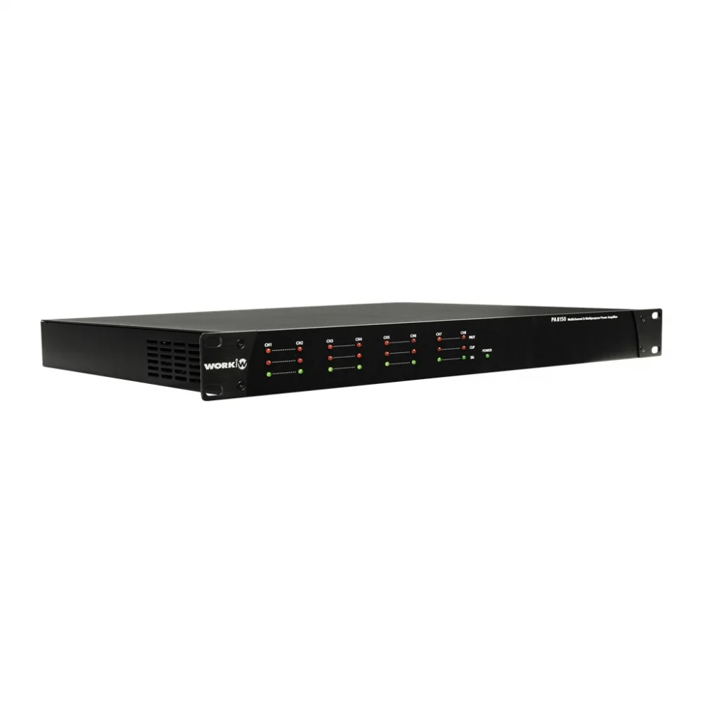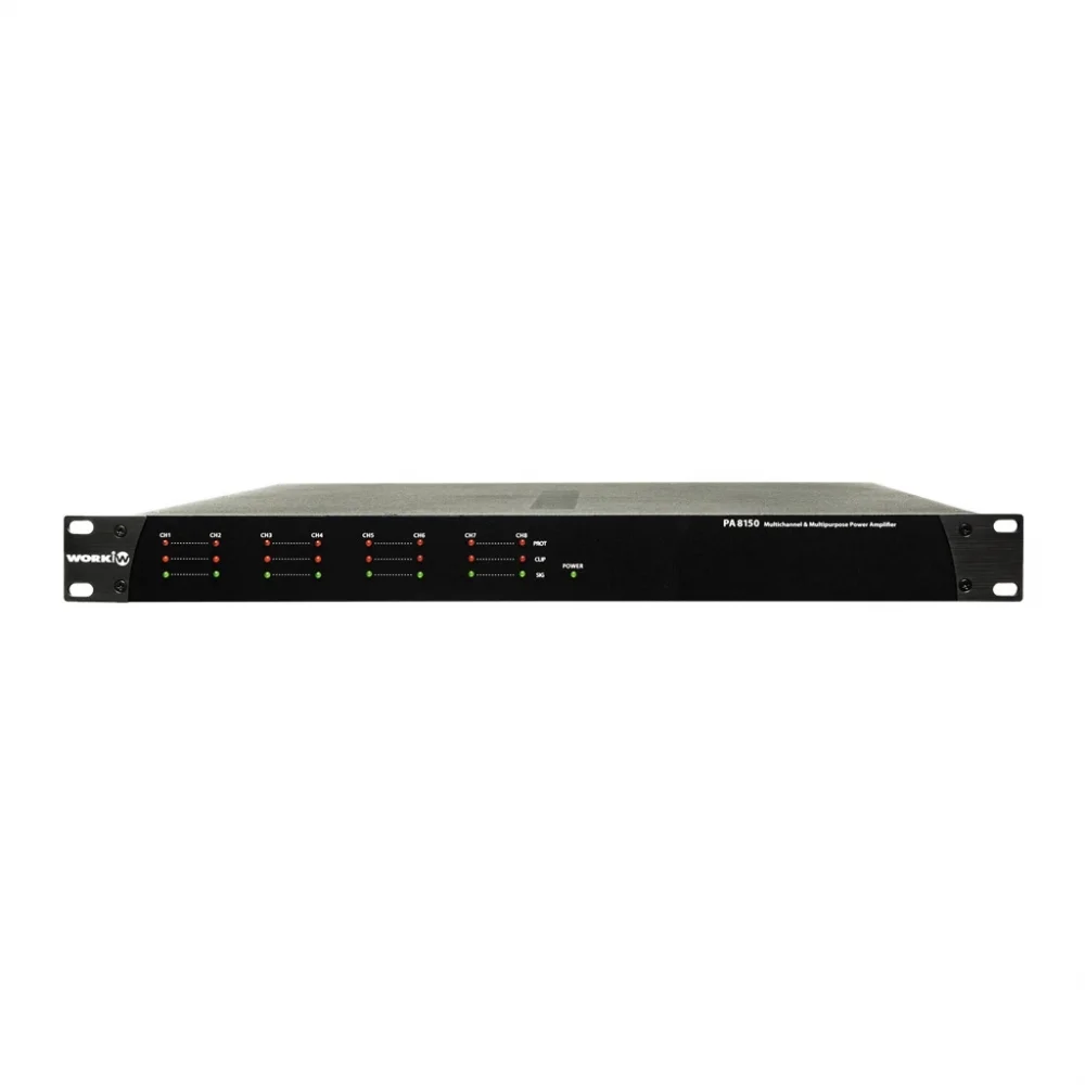 PA 8150, 150 W @ 4 Ohm 8 kanallı Sınıf D profesyonel ses amplifikatörüdür, 1 raf ünitesi metal muhafazaya yerleştirilmiştir. Euroblock konektörleri ile dengeli giriş ve çıkışlara sahiptir. Ön panelde güç, sinyal, klip ve koruma göstergeleri bulunur. Arkada güç anahtarı, bağlantılar ve kanal başına bağımsız ses kontrolü bulunur.