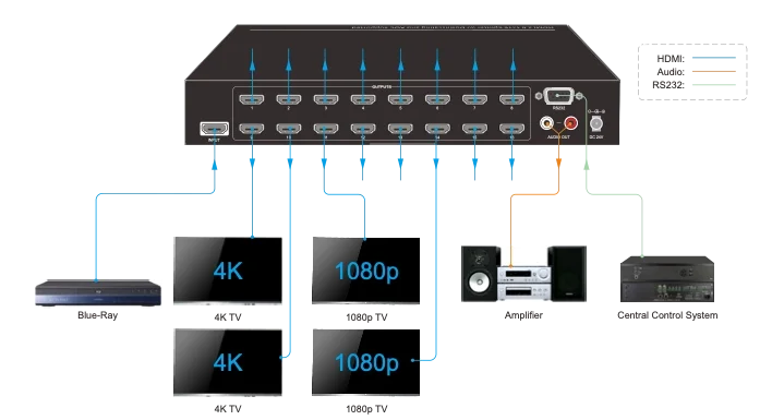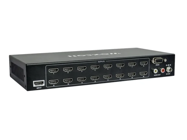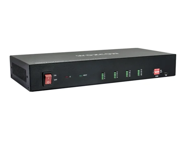 SUH124-H2 HDMI V2.0 1×24 Splitter, tek bir HDMI girişini on altı HDMI çıkışına dağıtabilir. Splitter, 4K@60Hz 4:4:4'e kadar 4K sinyalleri, HDR 10 ve Dolby Vision'ı destekler ve ünitenin ön panelindeki 4 pinli DIP anahtarıyla gelişmiş EDID yönetim seçeneğine sahiptir. Ayrıca, yalnızca 1080p'ye kadar çözünürlüğü destekleyen bir ekrana bağlandığında 4K video girişinin otomatik olarak 1080p çıkışa ölçeklendirilmesini sağlayan küçültme özelliğini de destekler. HDMI girişinden ses ayrıştırma için stereo analog Sol/Sağ ses çıkışı bulunur ve splitter, CEC ve RS232 kontrolünü destekler.