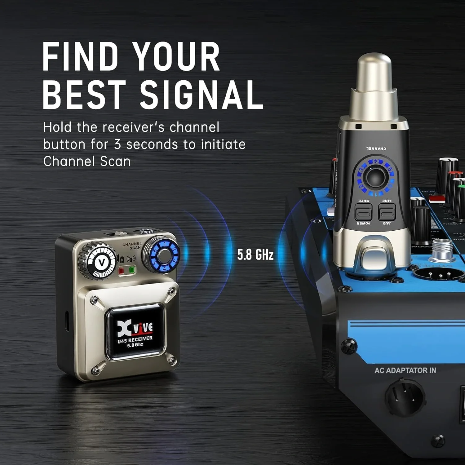 Xvive XV-U45R4, kompakt yapısı, yüksek ses kalitesi ve düşük gecikme süresi ile profesyonel kullanım için ideal bir kablosuz kulak içi monitör sistemidir. 5.8 GHz frekans bandı sayesinde 2.4 GHz cihazlardan kaynaklanan parazitleri minimize eder. Kullanıcı dostu tasarımı ve hızlı şarj özelliği ile sahne ve stüdyo ortamlarında güvenilir bir performans sunar.