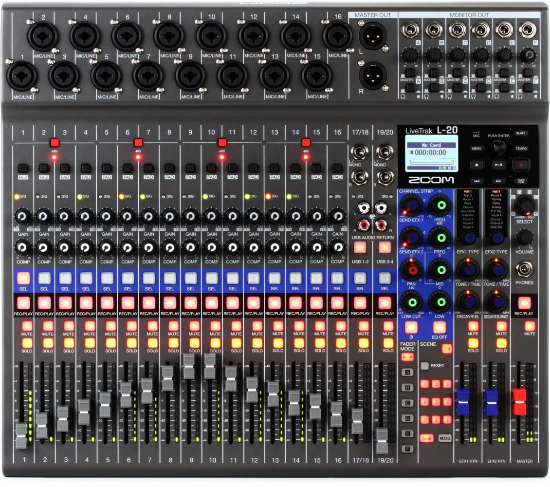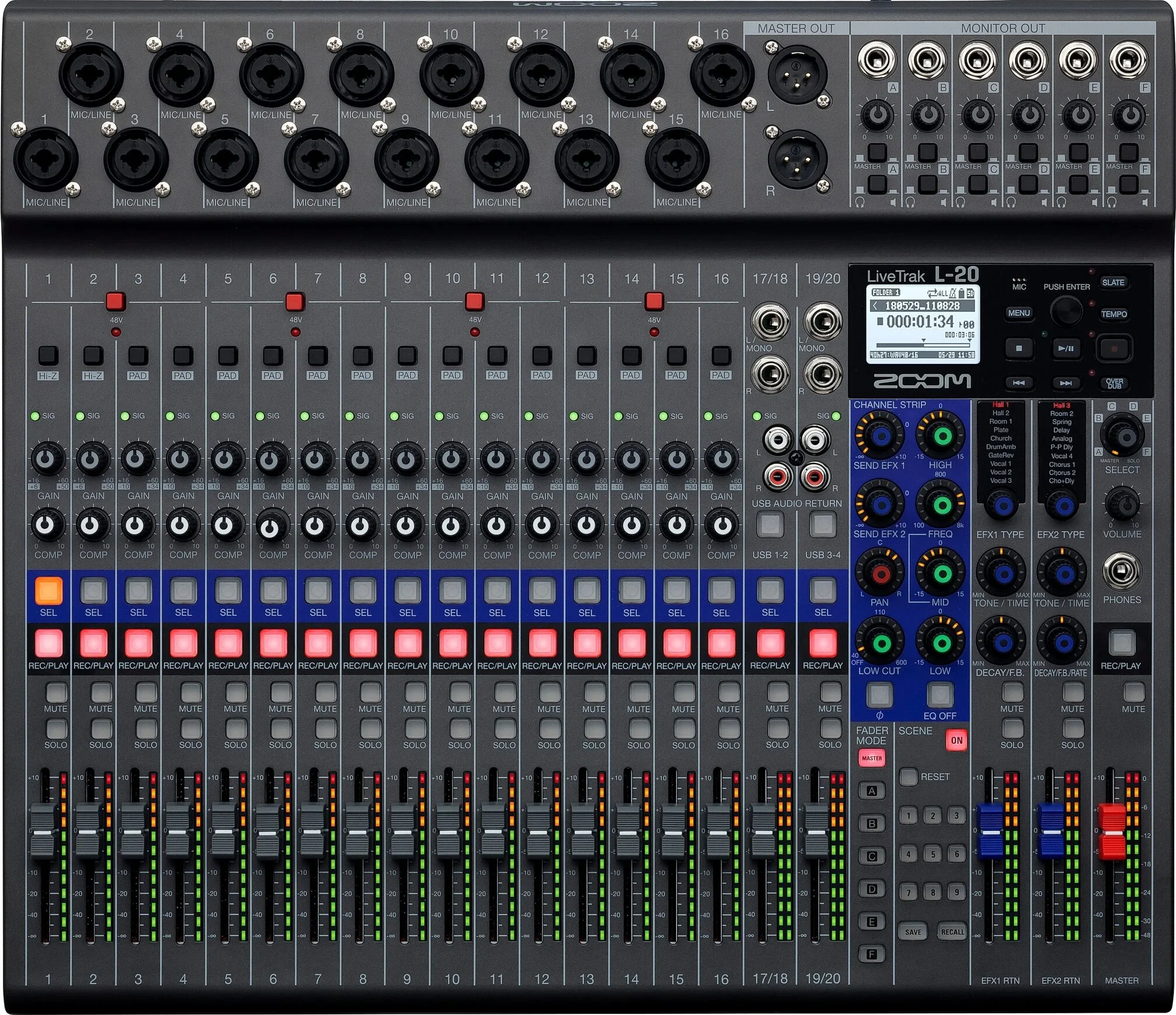 Zoom LiveTrak L-20, canlı performanslar, stüdyo kayıtları ve prova çalışmaları için tasarlanmış, çok yönlü bir dijital mikser ve çok kanallı kayıt cihazıdır. Hem bir mikser hem de bir ses arabirimi olarak işlev gören bu cihaz, sunduğu özelliklerle dikkat çekiyor: